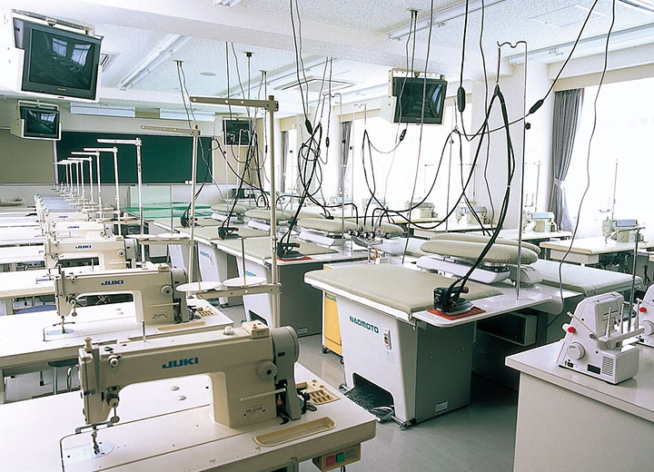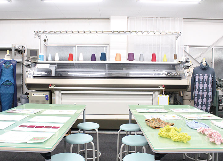 島精機製作所のホールガーメントコンピュータ横編機(完全無縫製型)および対応のニットデザインシステムを導入。パソコン画面でのニットデザインから、編地の組み立てや成形編みなどコンピュータによる生産実習を学びます。学内で、無縫製ニット作品の制作ができる学校は全国でも珍しい。