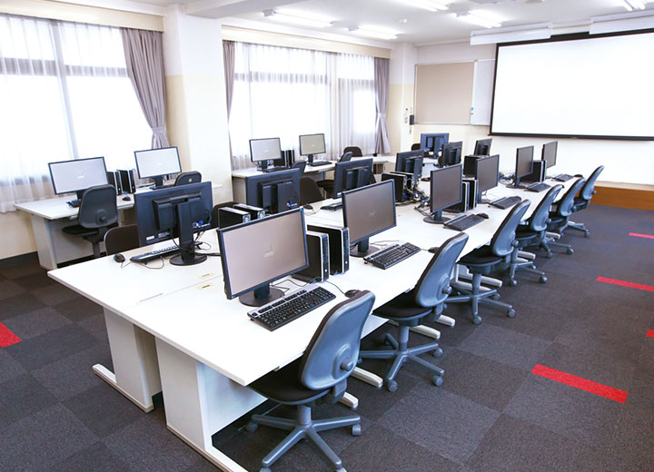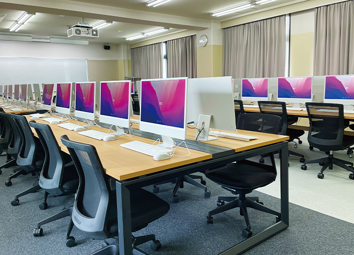 学内にMacを81台設置。Adobe Creative Cloudを導入し、最新のイラストレーター、フォトショップのほか、動画や音楽の編集が可能。また、ビジネスユースのソフトも使えるので、幅広くパソコンスキルを身につけることができます。