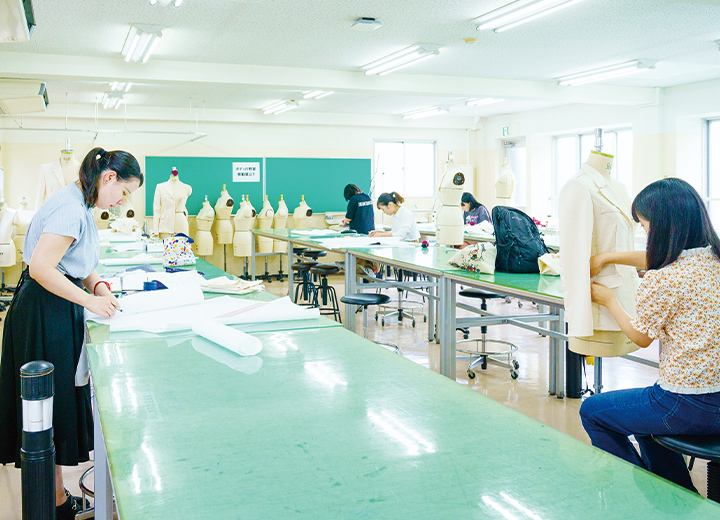 パターンメーキング・ドレーピングの専用教室。作業を行うために十分な広さと、1人1体のボディを完備。