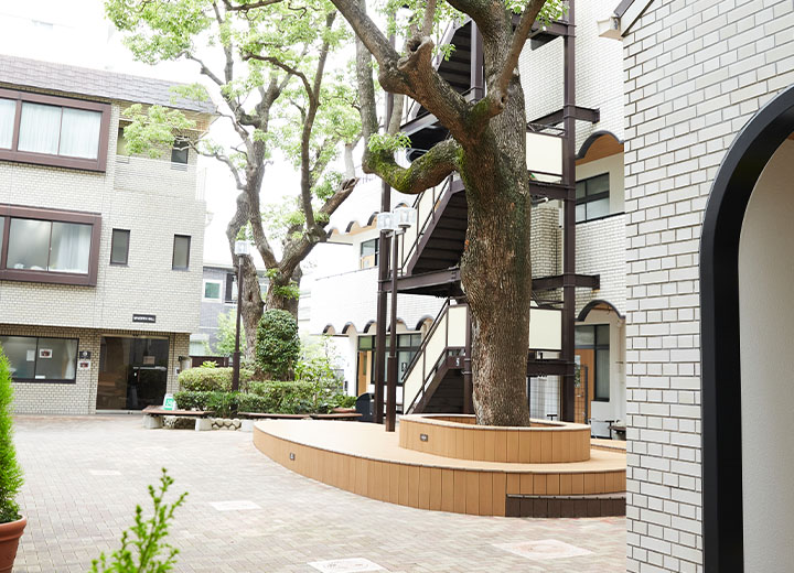 緑あふれる中庭には、ウッドデッキが誕生。天気の良い日には、学生たちが談笑する姿が見られます。