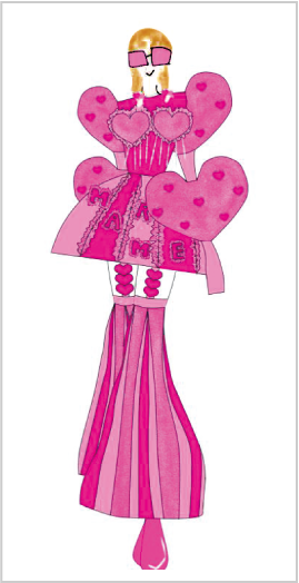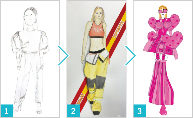 ファッションデザインの基礎となる、さまざまなテーマを元にインスピレーション源から発想し、デザイン展開の方法を学びます。