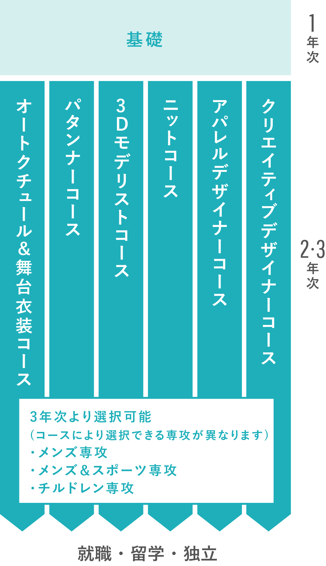 基礎を学んだ後、個性を発揮できる分野へ進みます。