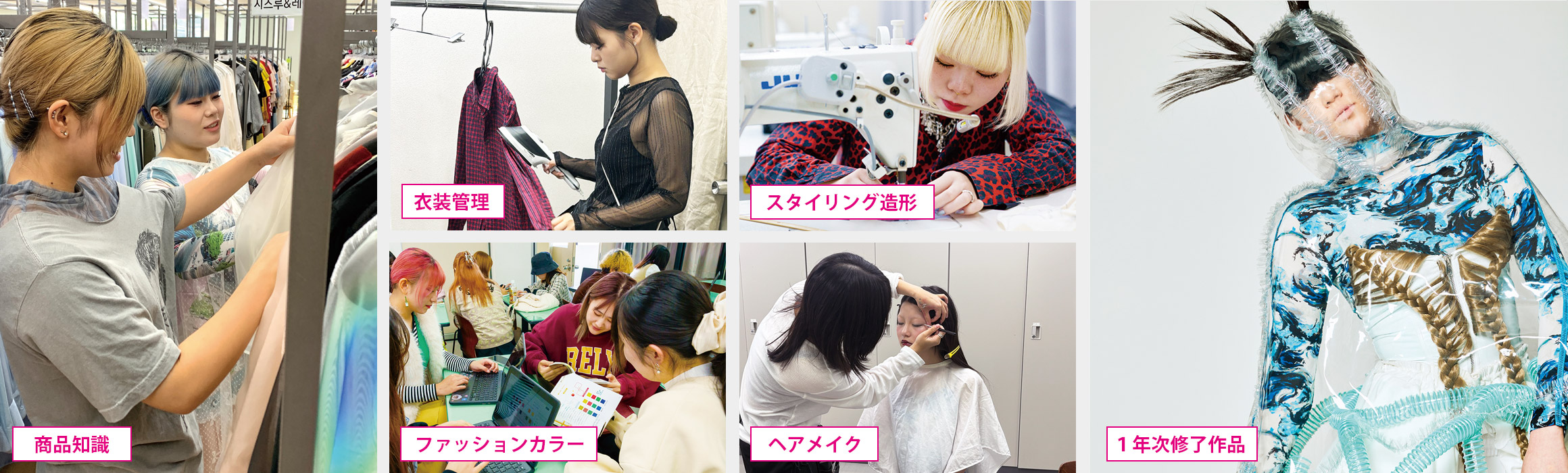 スタイリストの基礎となる知識・技術を学び、撮影実習やインターンシップなどの現場研修を経験します。
