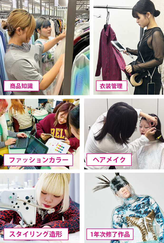 スタイリストの仕事は、テレビに映画、雑誌、CM、ショーなどはもちろん、近年ではECサイトやSNSなどにも活躍の場が広がっています。1年次ではスタイリストの基礎を習得。2年次ではコース専攻により、めざす仕事へとステップアップします。
