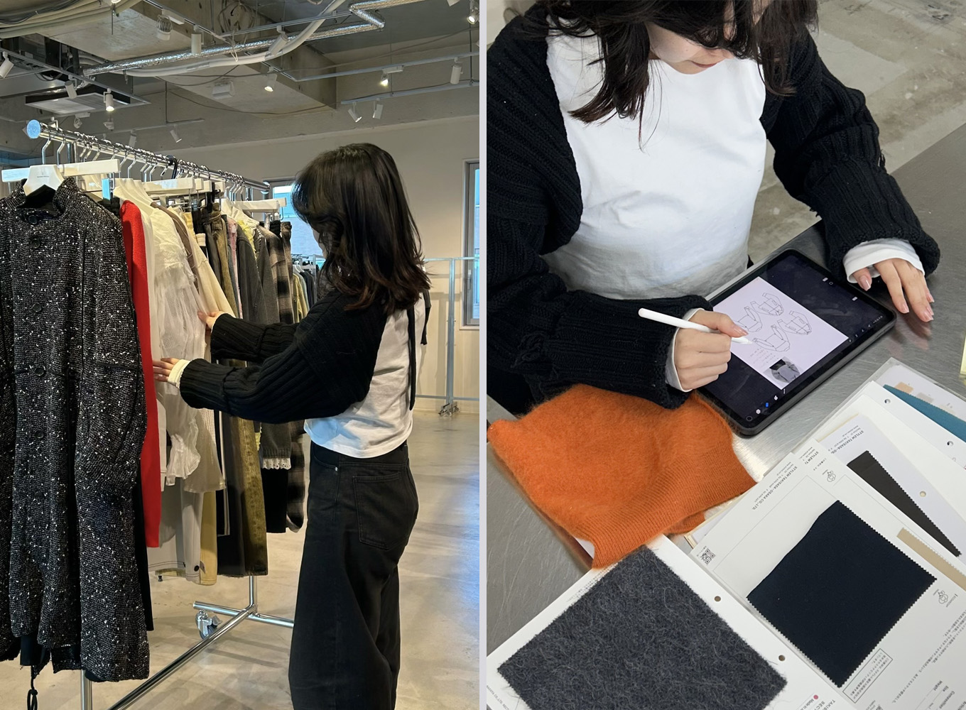 「MAISON SPECIAL」の世界観が好きで、ここで更に服作りを学びたいという思いで入社。少しの工夫やアイデアで売れ筋が変わるのは毎シーズン面白いです。トレンドを敏感にキャッチしてデザインに落とし込む難しさに日々頭を悩ませますが、学生時代、忍耐と闘いながらもブランド立ち上げを経験出来たことは、この仕事で答え合わせが出来ているような感覚です。自身の作品が日の目を浴びた時には言葉では表せない喜びがあり、ファッションを仕事にしたいと改めて感じた瞬間でした。