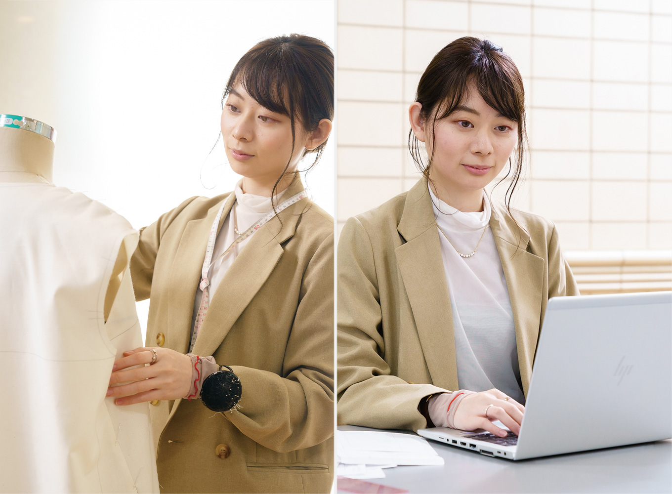 「MAISON SPECIAL」の企画デザイナーとして勤務中。"ファッションは楽しい"という想いを多くの人に届けたくてこの道を選びました。学生時代のインターンをきっかけに前職へ新卒入社し、デザイナーとして5年間基盤を学びました。現在はよりクリエイティブに強いメーカーで理想と現実のバランスに向き合いながら服づくりに励んでいます。試行錯誤して作り上げた1着を素敵に着用してもらえることにやりがいを感じています。将来は自信を持って“デザイナー・ディレクター”と名乗れる存在を目指し、いつか若手デザイナーを支援できる環境を作りたいと考えています。