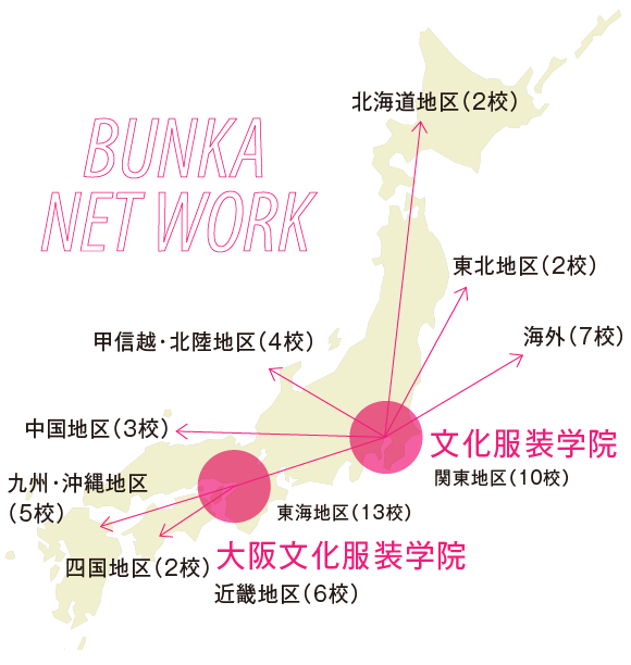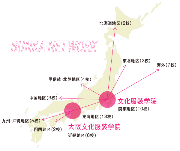 文化服装学院連鎖校のネットワークは全国に広がり、創立90余年の歴史を持つ文化服装学院(東京)とともに日本のファッション業界をリードしてきました。教育・研究のさまざまな面で相互に協力し、高度なファッション教育を実施しています。当校大阪文化服装学院は、森慈郎会長が連鎖校協会理事、日本ファッション教育振興協会評議員、ファッションビジネス学会関西支部長、関西ファッションカレッジコンソーシアム理事長を兼務するなど、日本のファッション教育界において重要な役割を果たしています。