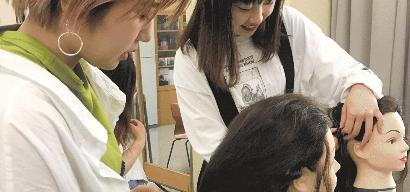 スタイリングやネイル、メイク技術はもちろん、SNSの活用などの幅広い知識を習得できるのが魅力。ショップでの接客などの実習も充実しており、流行の変化を最前線で体験しながら、感性と発信力を磨きます。