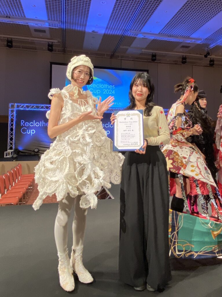 古着をアップサイクルした作品のコンテストブックオフ主催「第3回 Reclothes Cup」で、ファッション・クリエイター学科 クリエイティブデザイナーコース3年 梛野結花さんが、審査員特別賞を受賞しました。