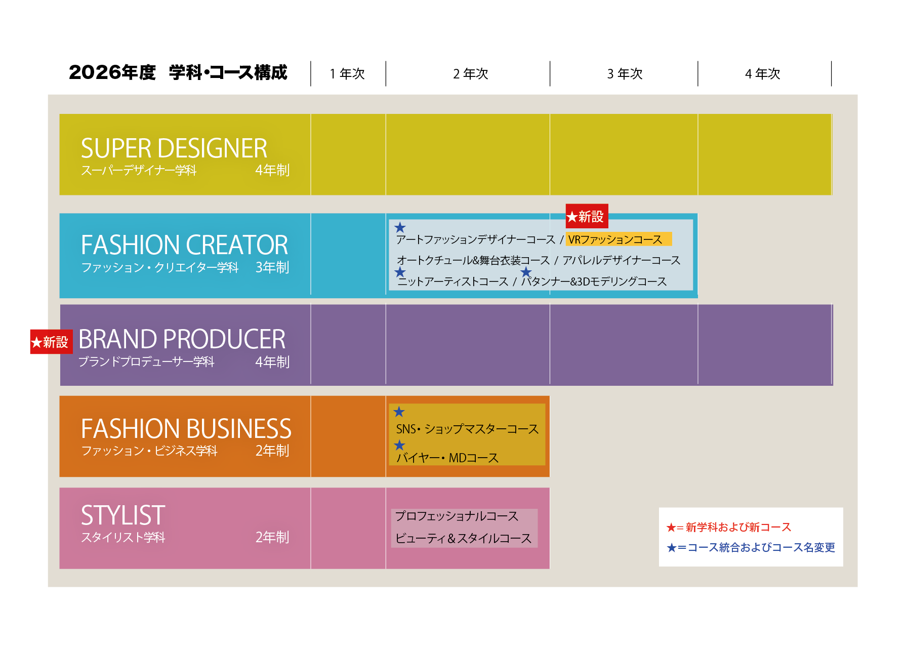 新校名「ヴォートレイル ファッション アカデミー」として始動するにあたり、学科・コースの新設や統合、名称変更など、教育プログラムの再編を行います。新学科として、起業家など高度なビジネス人材を育成する4年制学科「ブランドプロデューサー学科」を新設。また、デジタル分野では、ファッション業界のみならず、映像・エンタメ・ゲーム業界にまで領域を拡張する「VRファッションコース」を立ち上げます。 *学科・コースの新設・変更は届出準備中