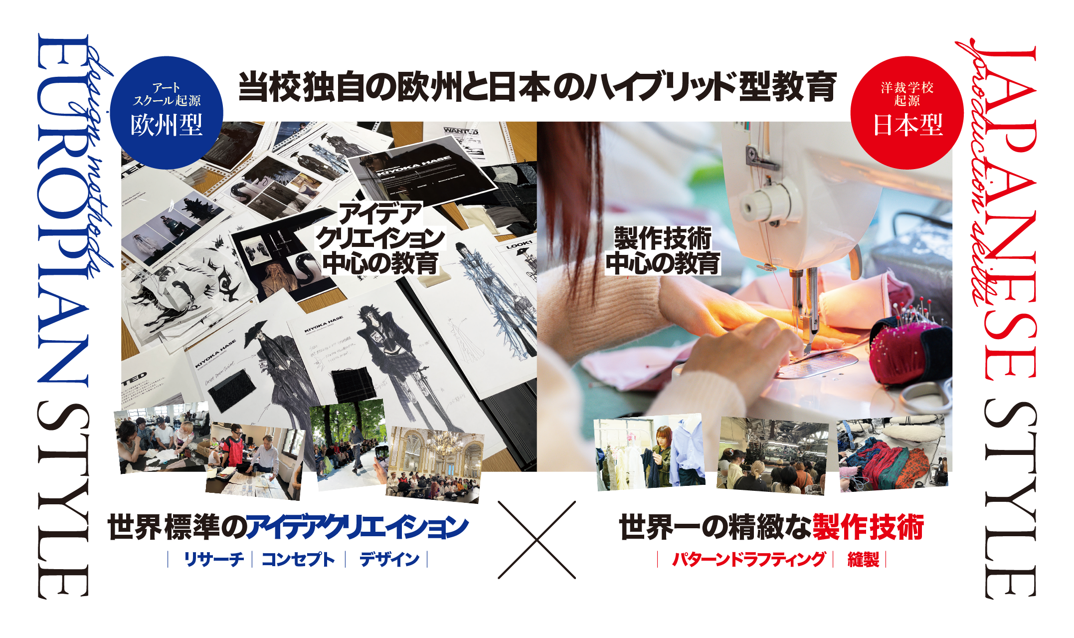 1952年に「文化服装学院(東京)」の連鎖校に認定されて以来、当校は「大阪文化服装学院」として「文化式教育」を基盤に独自のカリキュラムを発展させ、教育の質を高めてきました。パターンメーキングや縫製など「文化式原型」を基とした精緻な製作技術を習得する教育手法を着実に定着させる中、デザイン教育においては、1998年にイタリア・フィレンツェで開催された「ビエンナーレデラモーダ」に招待され、Polimoda校との連携を深めたことを契機に、ヨーロッパのアイデアクリエイション手法を導入これらを融合した独自の教育ノウハウを確立してきました。