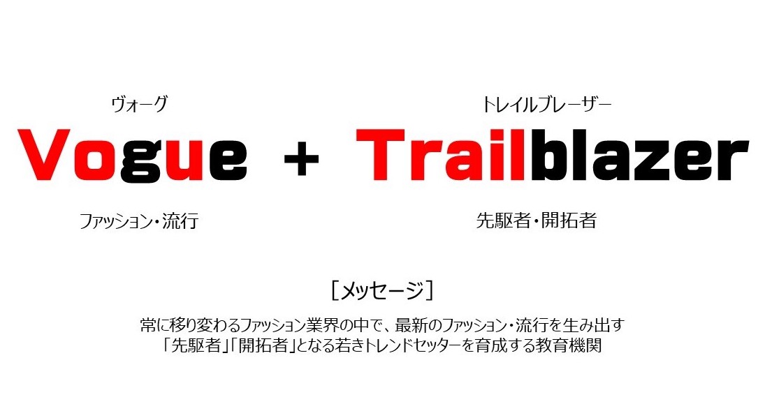 新校名「ヴォートレイル ファッション アカデミー(VOUTRAIL THE FASHION ACADEMY)」は、「Vogue(ファッション・流行)」と「Trailblazer(先駆者・開拓者)」を掛け合わせた造語です。『常に移り変わるファッション業界の中で、最新のファッション・流行を生み出す「先駆者」「開拓者」となる若きトレンドセッターを育成する教育機関』であろうという強い意志を込めています。この名の通り、トレンドに追随するのではなく、唯一無二を追求し、新たな価値を創造できる人材を育成してまいります。