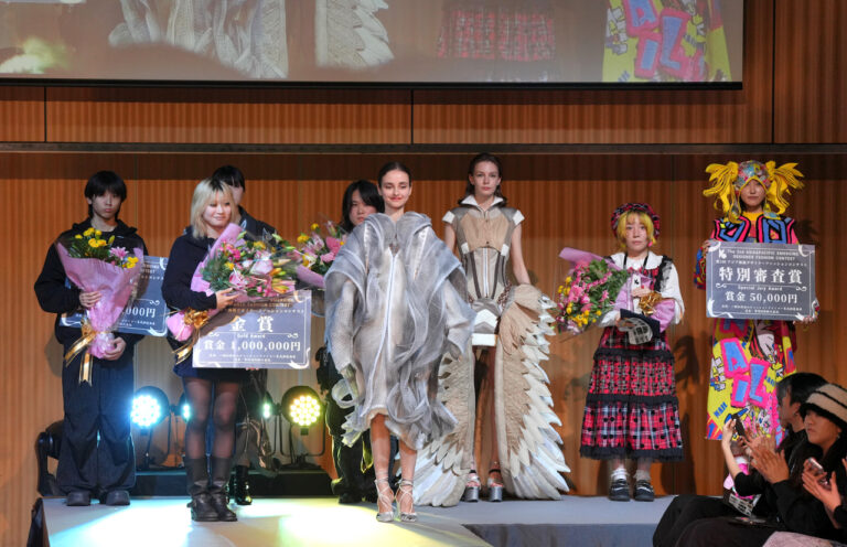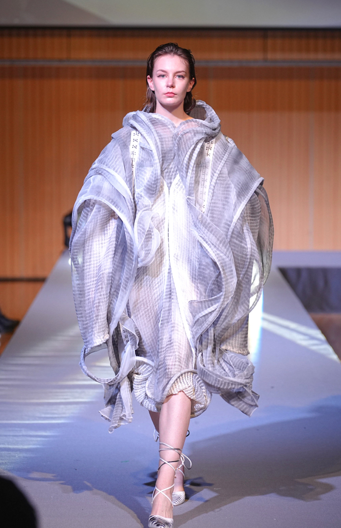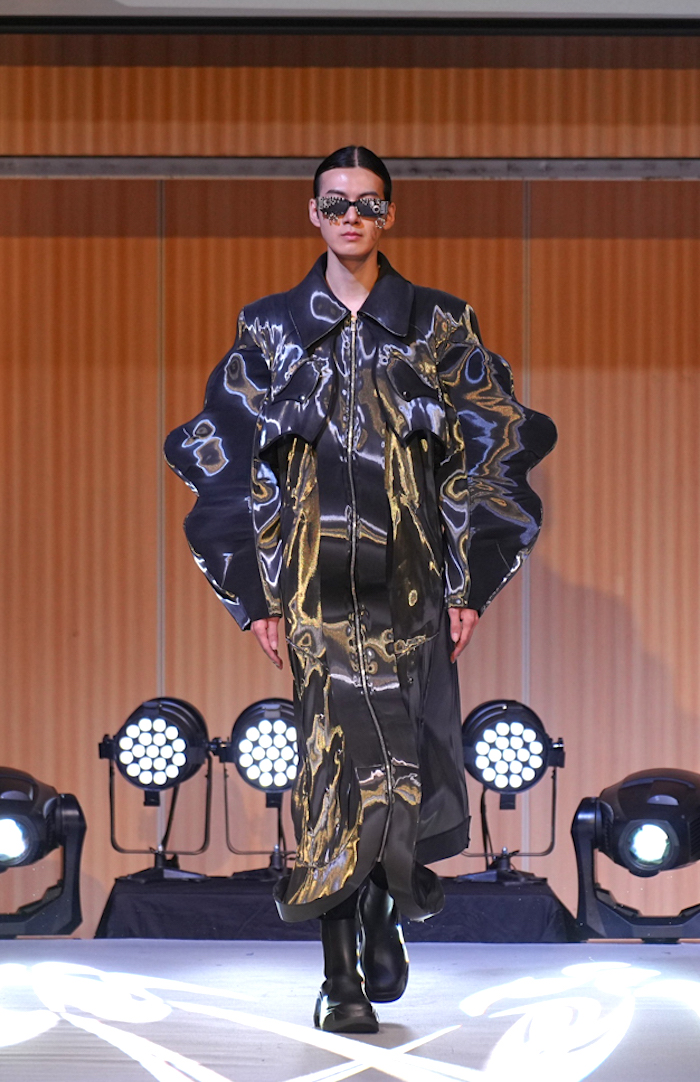 片山さんのコメント: 「リハーサルを見て自信をなくしていたため、準グランプリと発表された瞬間は全く実感が湧きませんでした。今回のテーマ『DISTORTION(歪み)』は、年齢を重ねるにつれて人の姿勢が歪んでいくことからインスピレーションを得ています。制作ではいかにシルエットを美しく見せるかにこだわりました。ステンレスのような無機質で光沢感のある素材を用い、テーマである『歪み』を流動的なフォルムに落とし込みました。審査員の方々からシルエットの新しさや形の美しさについて評価をいただけたことが何よりも嬉しかったです。」