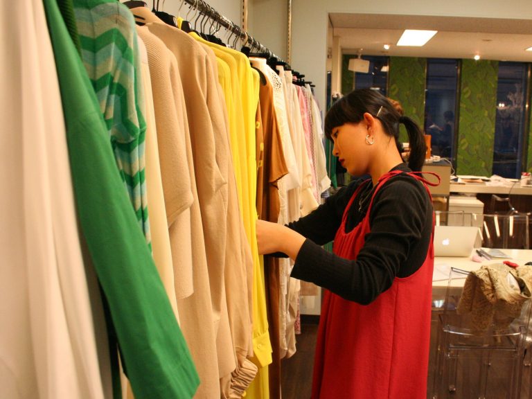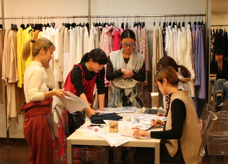 スタイリングを組むために、学生たちは、10月、東京・青山のIZAのプレスルームを訪問。アイテムチェックを行うとともに、モデルさんと打合せを行い意見交換。