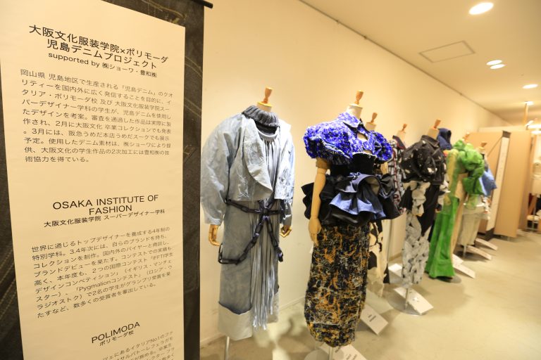 そして、昨年に引き続き、特別企画として、大阪文化とポリモーダ校で取り組んだ「児島デニムプロジェクト」の作品展示も行われました。