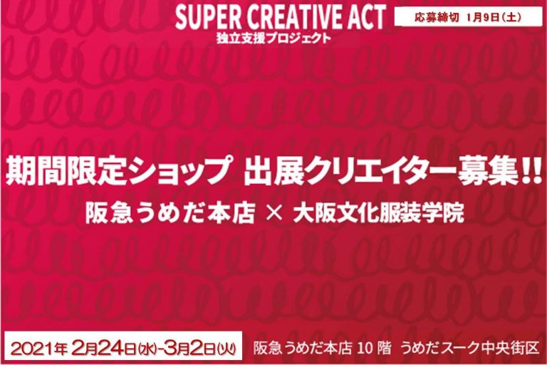 来春2月24日~3月2日、当校 大阪文化服装学院は、卒業生や在校生によるブランドやクリエイションを支援するインキュベーションプロジェクト「SUPER CREATIVE ACT」の一環として、阪急うめだ本店に、期間限定ショップをオープンします。