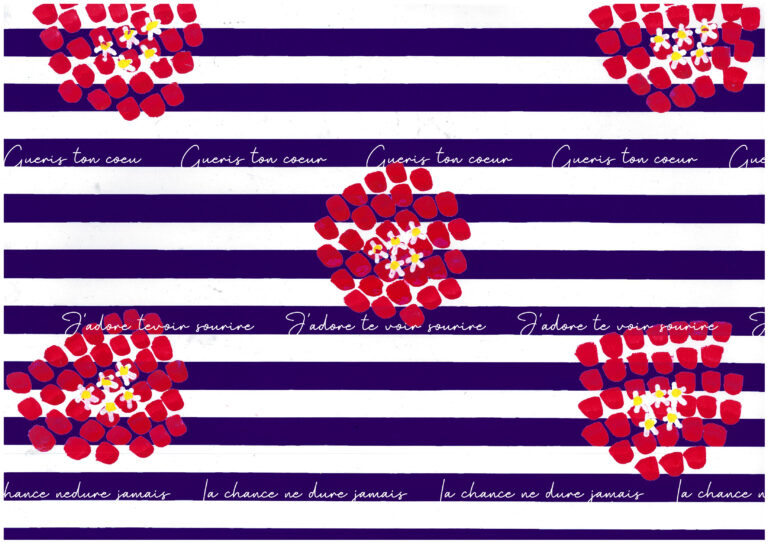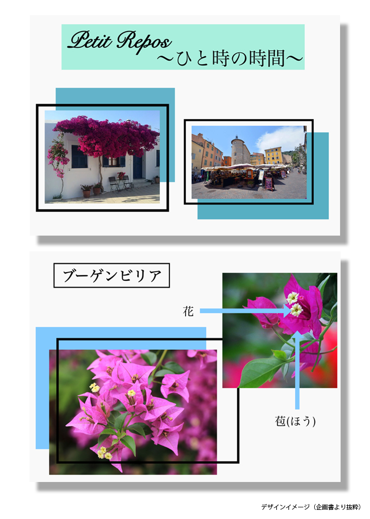 今回商品化された企画テーマは「Petit Repos〜ひと時の時間〜」。フランスのリゾート地イエール諸島に咲くブーゲンビリアの花をモチーフにテキスタイル図案を企画したものです。