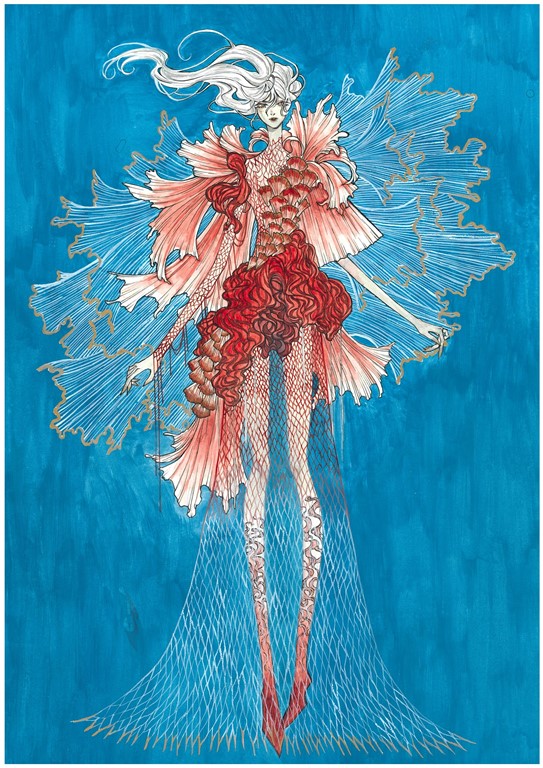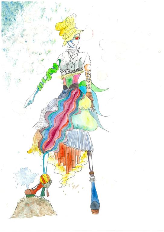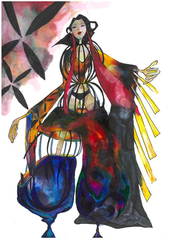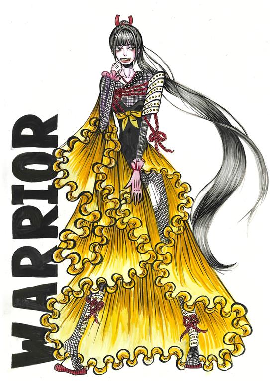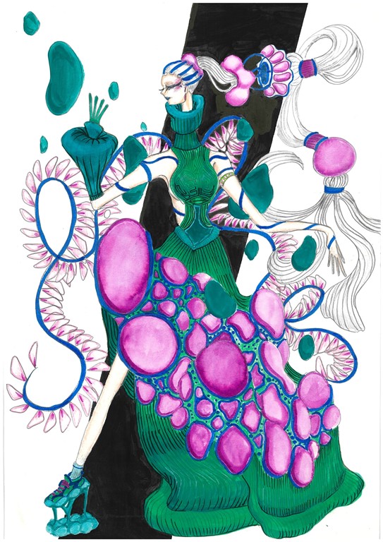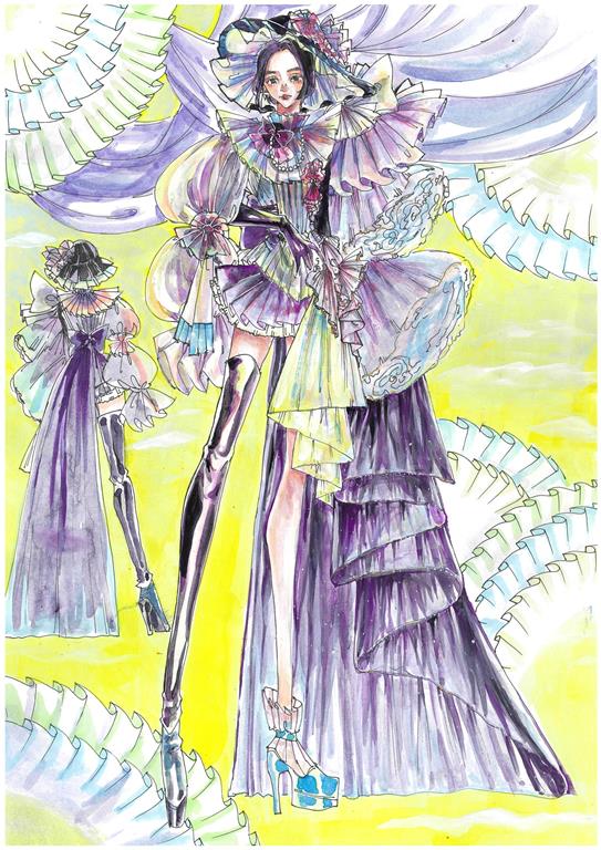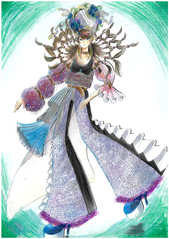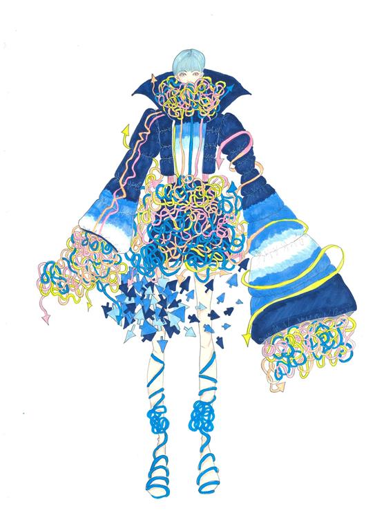 ≪関西ファッション連合(KanFA)講評≫ バランスの良いシルエットにローゲージニットのような、縄を編んだような線が繊細に描き込まれていて、強さと柔らかさが共存するインパクトのあるデザインになっています。スタイル画をマスキングし、その上から厚く背景色を乗せているため絵に立体感があり、そこも目を引くポイントになっています。