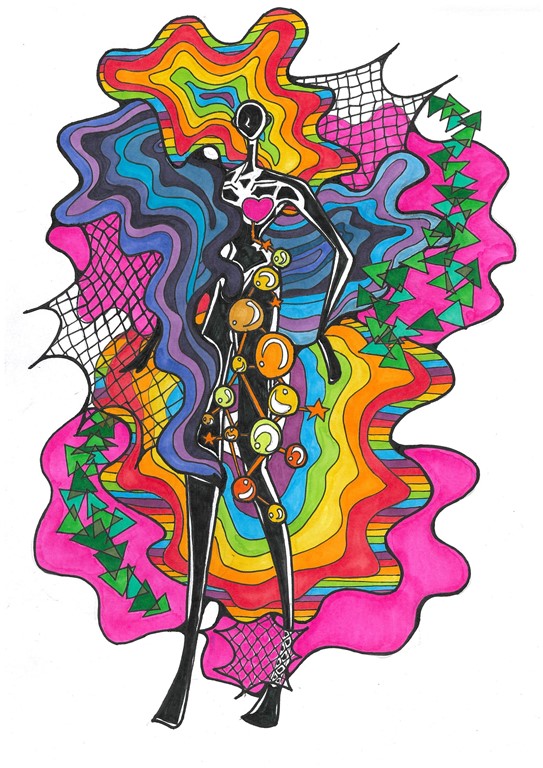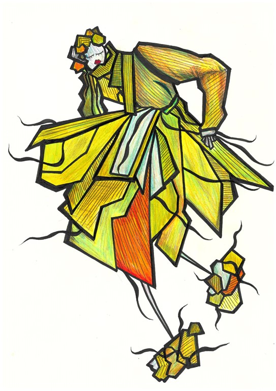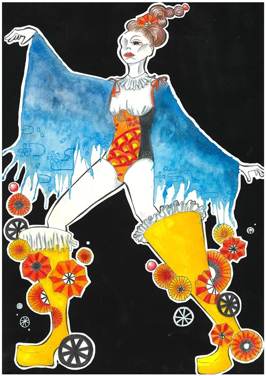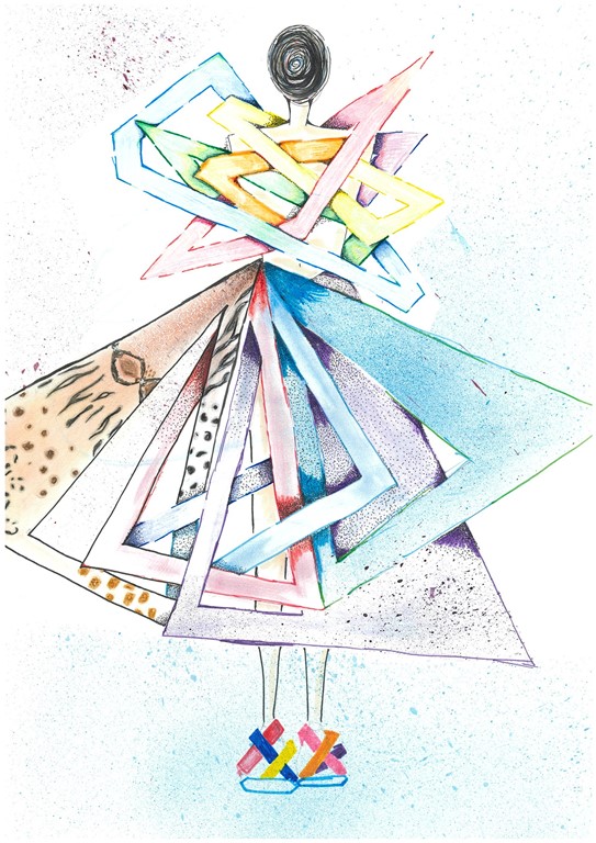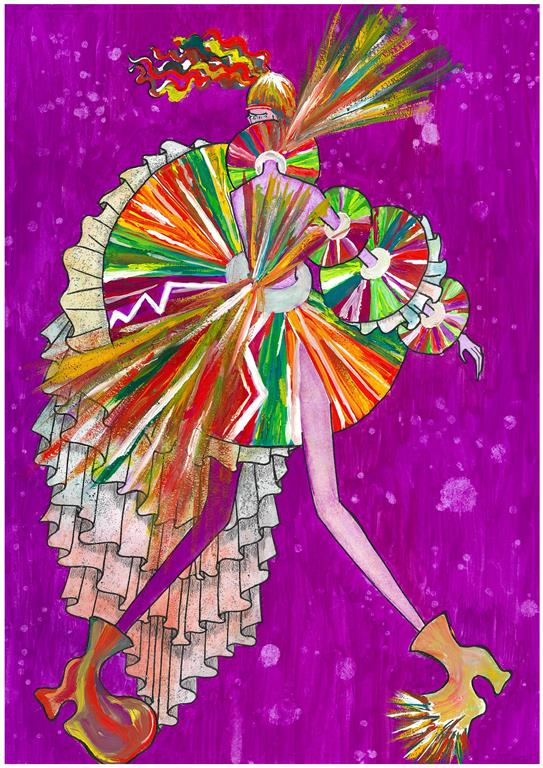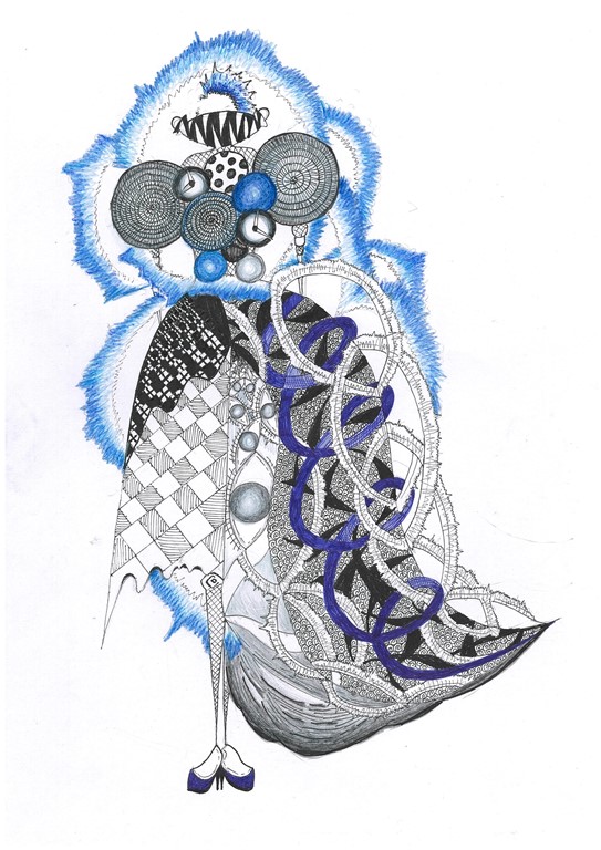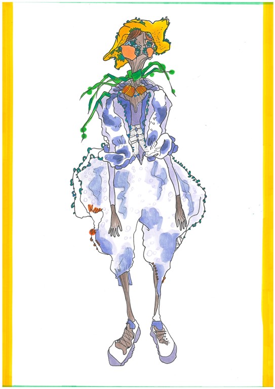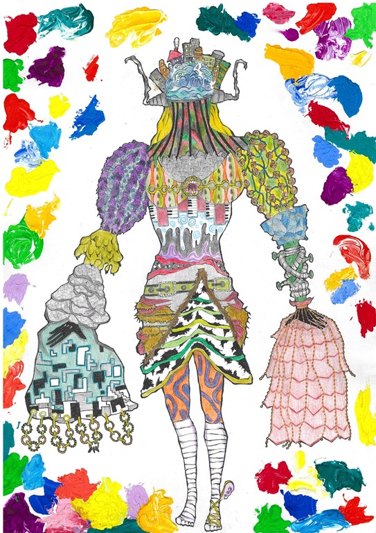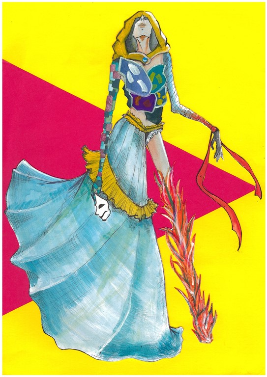 ≪関西ファッション連合(KanFA)講評≫ バランスの良いシルエットにローゲージニットのような、縄を編んだような線が繊細に描き込まれていて、強さと柔らかさが共存するインパクトのあるデザインになっています。スタイル画をマスキングし、その上から厚く背景色を乗せているため絵に立体感があり、そこも目を引くポイントになっています。