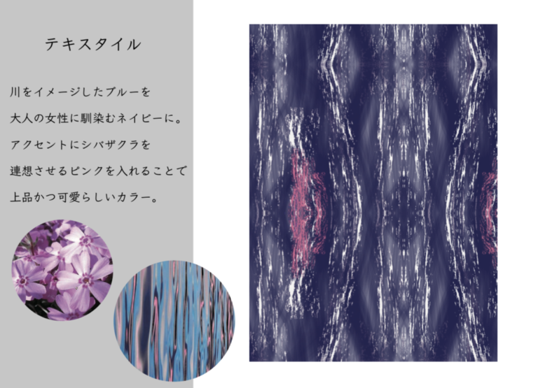オリジナルテキスタイルは、西脇市を流れる3本の川と、西脇市の市花であるシバザクラからインスピレーションを得ています。