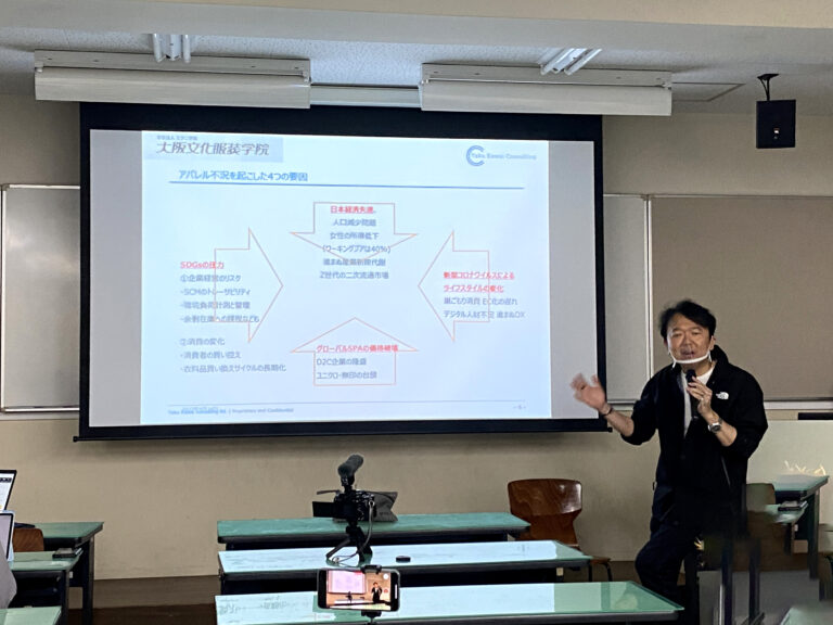 講義では、最近ファッション業界でもよく耳にするデジタル系ワード(DX、IoT、ビッグデータ、メタバース、NFTアート等)についての解説から始まり、SNSで人気のブランド「SHEIN」が、どうしてあれだけ安くモノを作ることができるのか?のからくりとデジタルの貢献要素まで、一流のコンサルタント故に知りえる「目から鱗」の情報を交え、大変わかりやすくご説明いただきました。