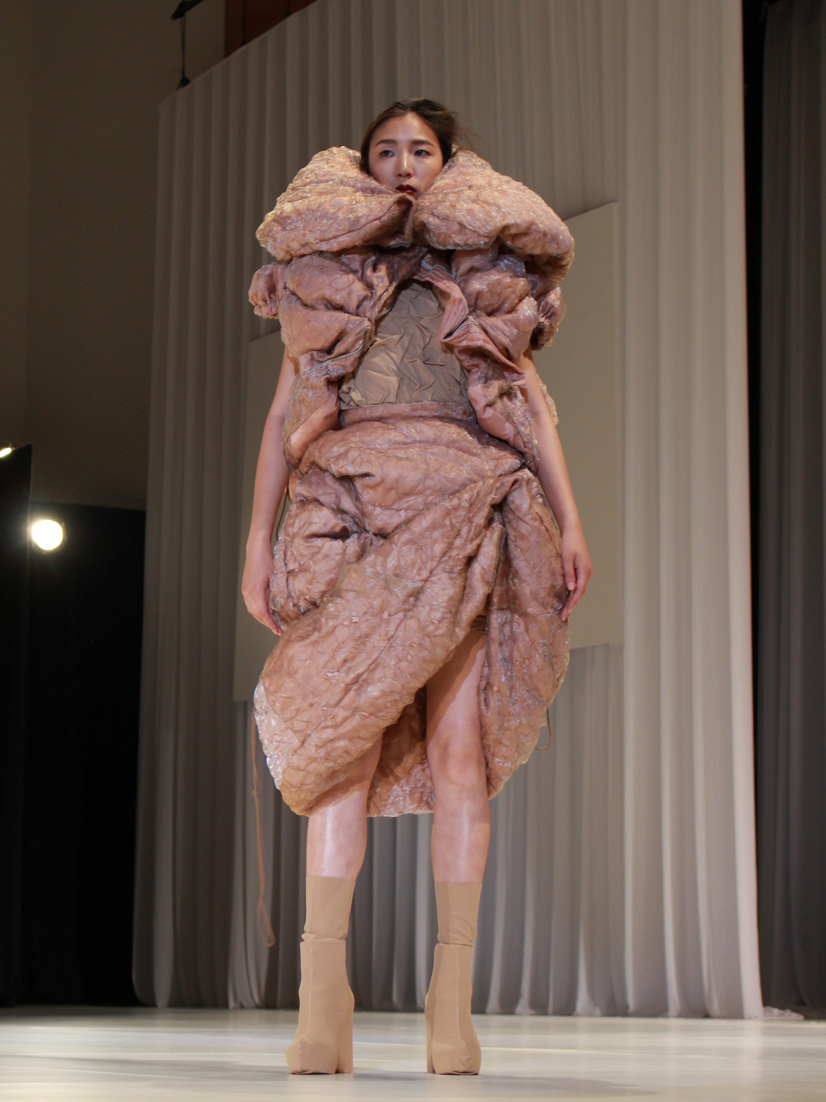 北条さんは、お年寄りのシワをモチーフに、オーガンディを熱加工し、サテンに重ねるなど、質感にこだわった、テクニカルな3体のコレクションを発表。