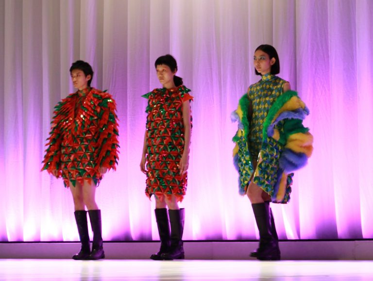 また、堂浦さんは、企業の社会的責任を意味する「CSR」のマークをモチーフに、ポリエステルの折り紙を1枚ずつつなぎ合わせた、細かな手仕事が際立つコレクションを制作lしました。