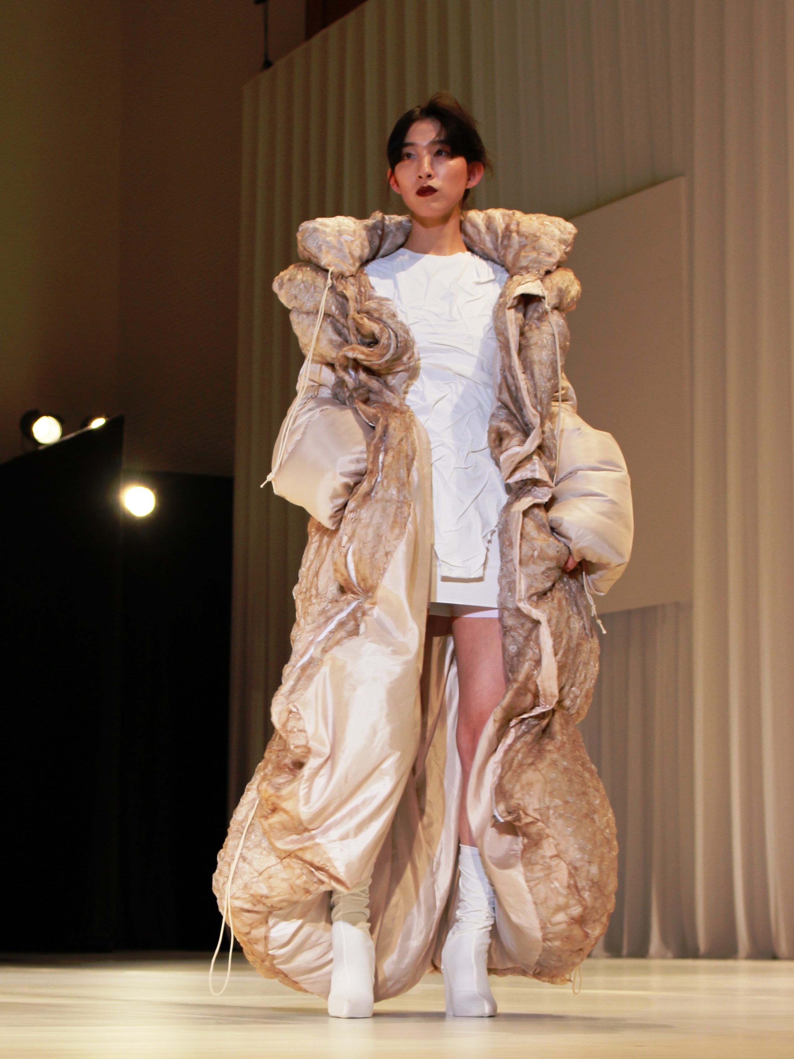 プロアマ問わず、国内外からハイレベルの作品が多数集まる中、最終選考に通過した14名のコレクションが発表されました。大阪文化服装学院からは2名、スーパーデザイナー学科4年 北条真奈さん、ファッション・クリエイター学科 クリエイティブデザイナーコースを今春卒業した堂浦純さんが、最終選考に挑みました。