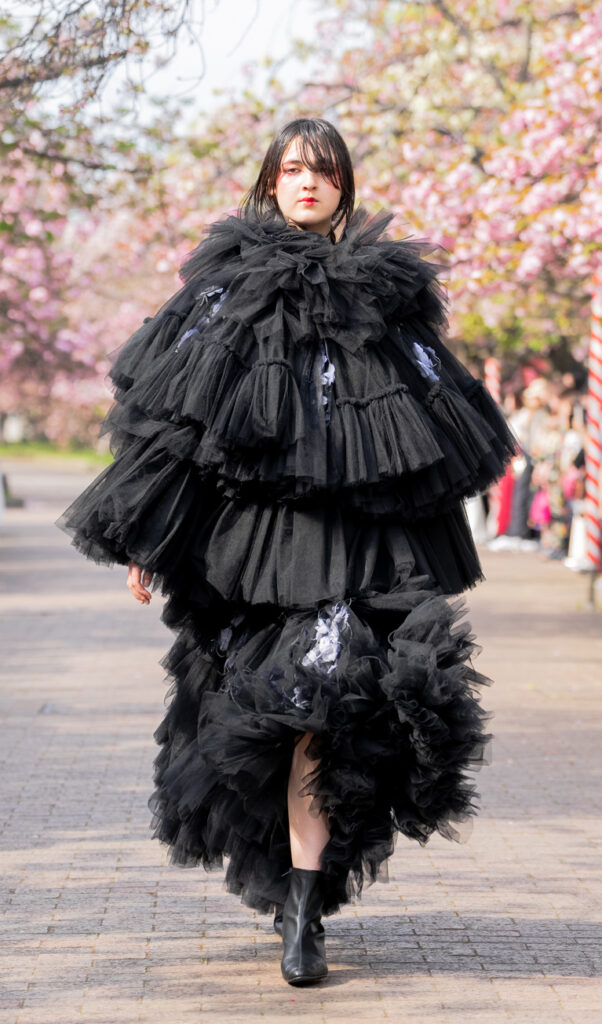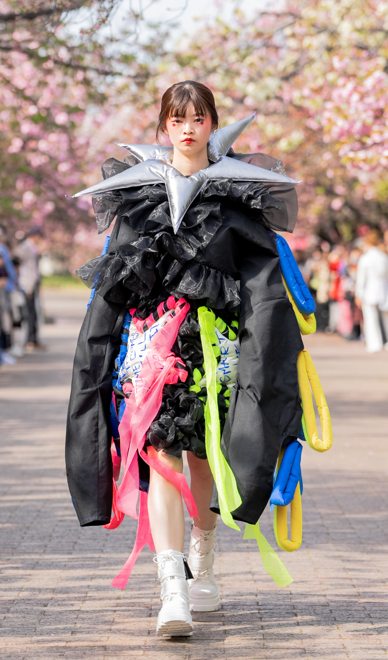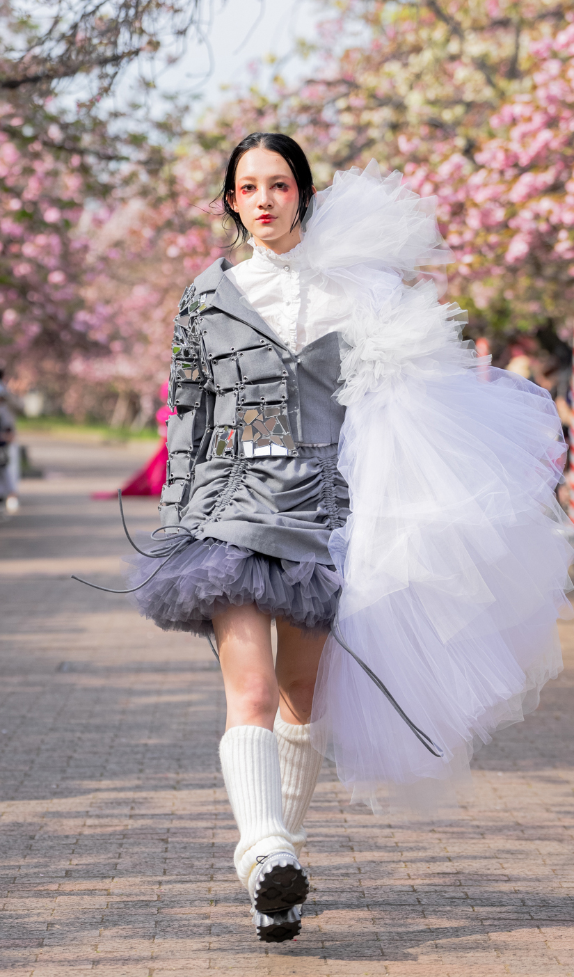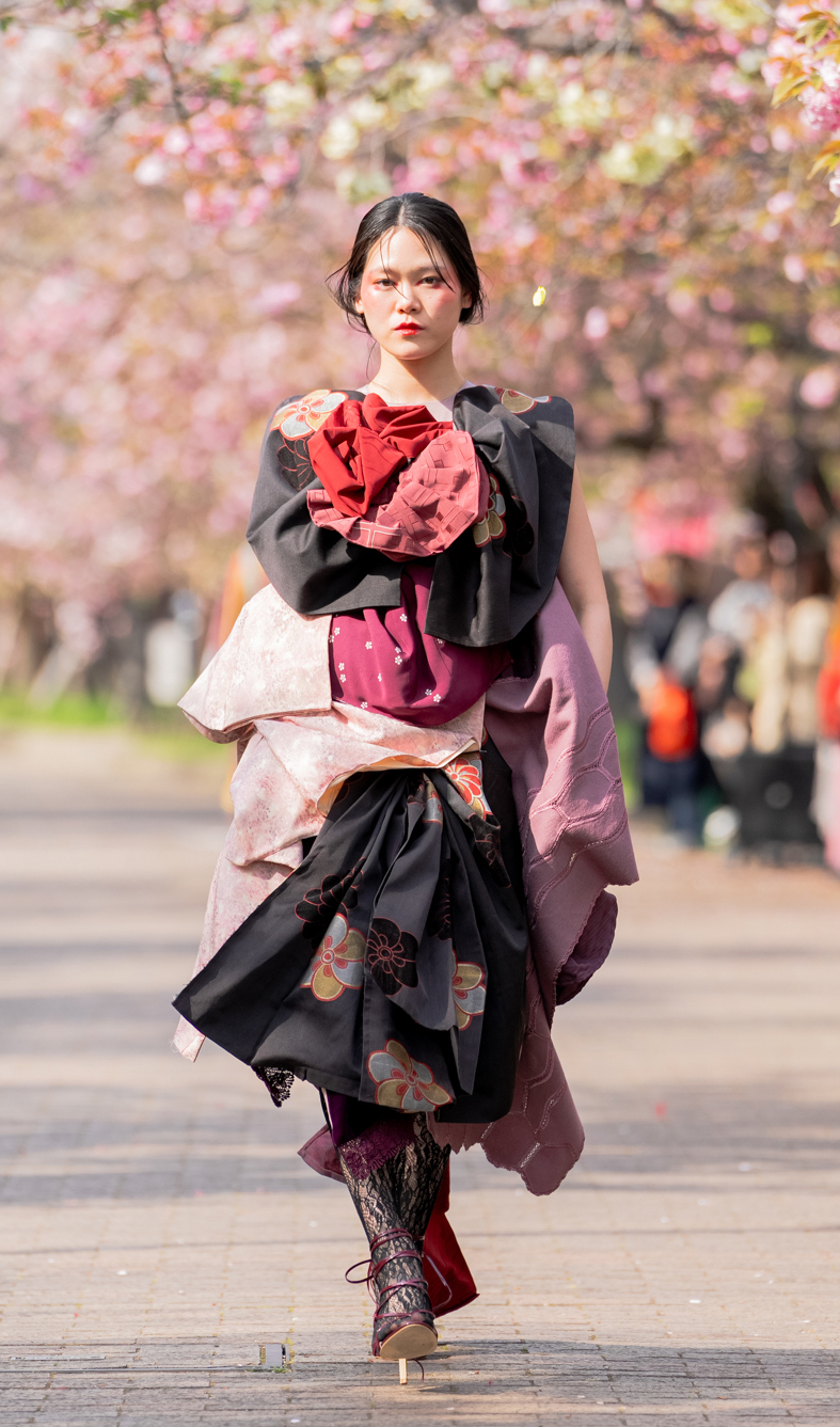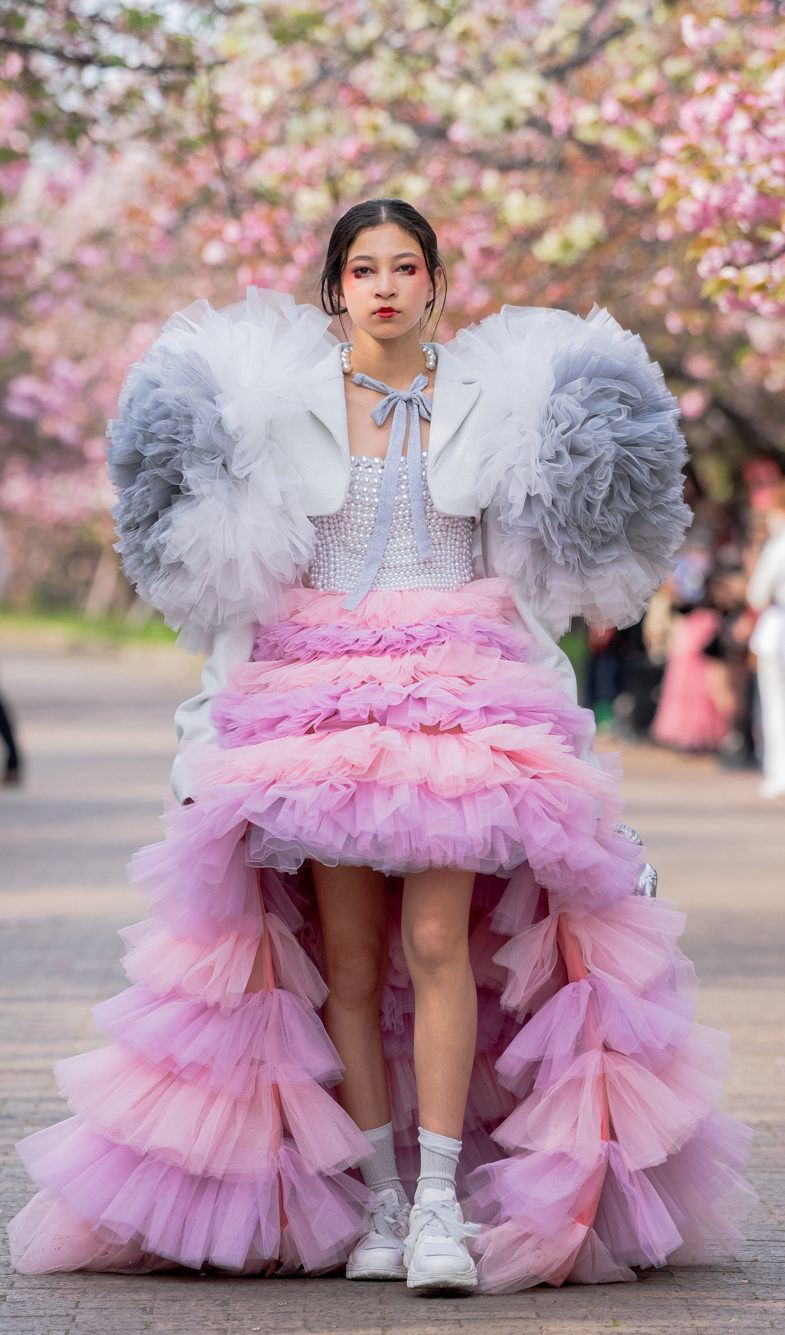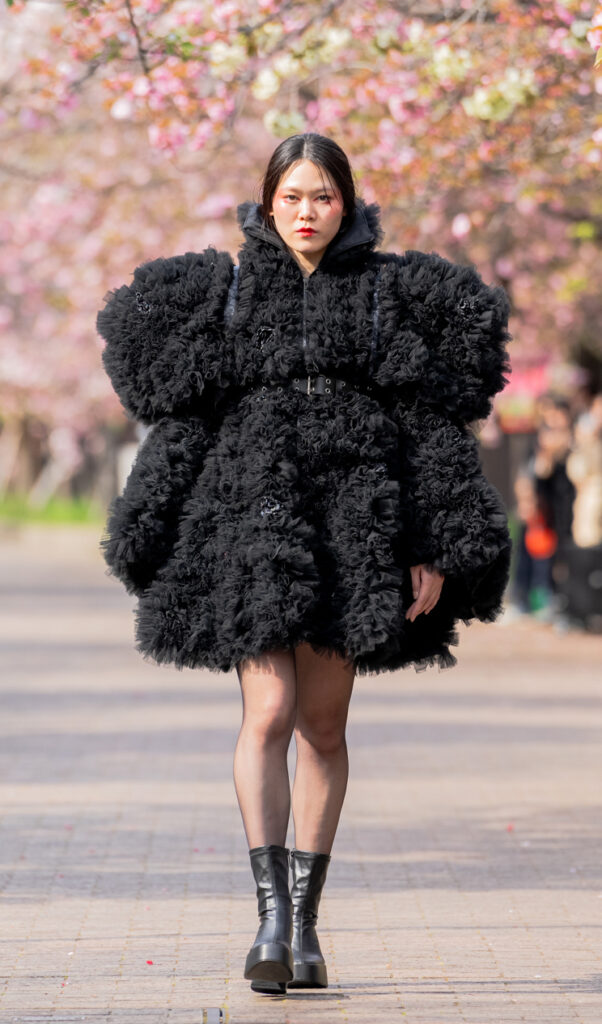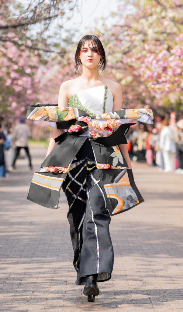 「ASIA FASHION COLLECTION」(主催:株式会社バンタン 株式会社パルコ)でグランプリを獲得し、今年2月ニューヨークコレクションでランウェイデビューを果たした学生ブランド「KIYOKA HASE」をはじめ、大阪文化の学生が手がけるハイレベルな作品が、桜並木のランウェイを彩り、「桜の通り抜け」の新たな魅力を発信しました。