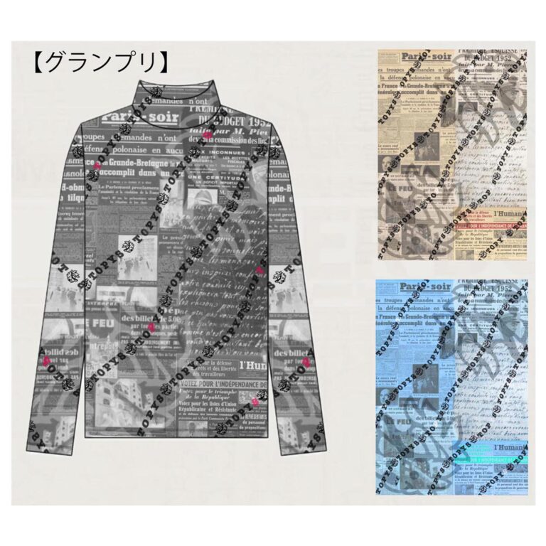 準グランプリを受賞したグループ(佐藤さん・竹森さん・村井さん・森本さん)の作品は、パリのお祭りをインスピレーションにエッフェル塔や花のモチーフをさり気なく入れ込んだレオパード柄風。テーマであるお祭りらしい華やかさを感じることができる作品。