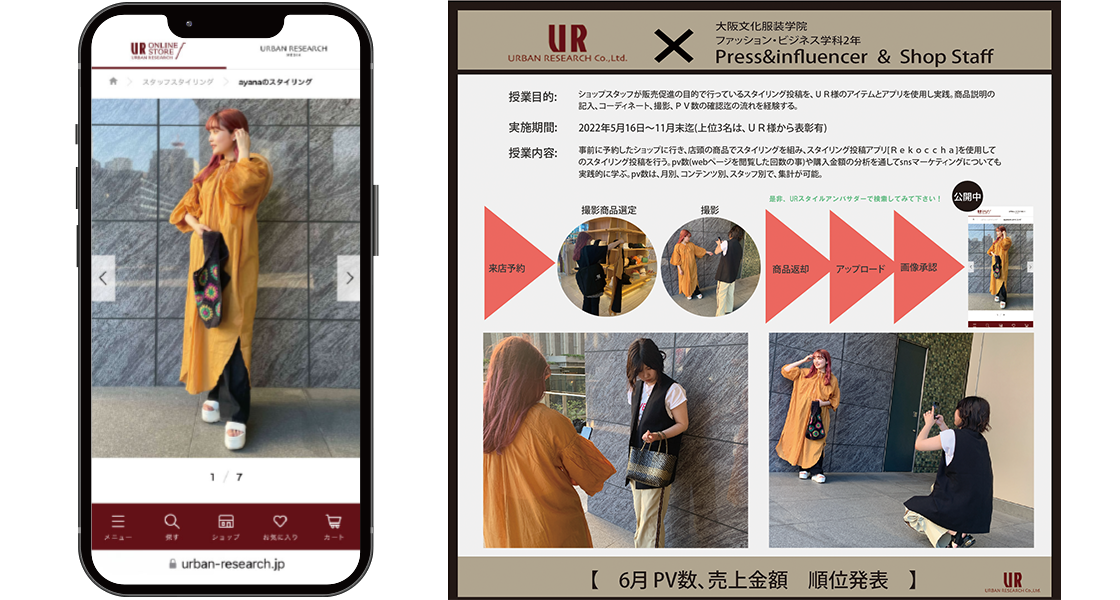 ファッション・ビジネス学科2年生が、アーバンリサーチの商品を自らセレクト、スタイリングしたアイテムを着こなしスナップ撮影。写真は、オンラインストアにアップされ、ページビューや購買につなげます。インフルエンサーとしての活動を実体験します。