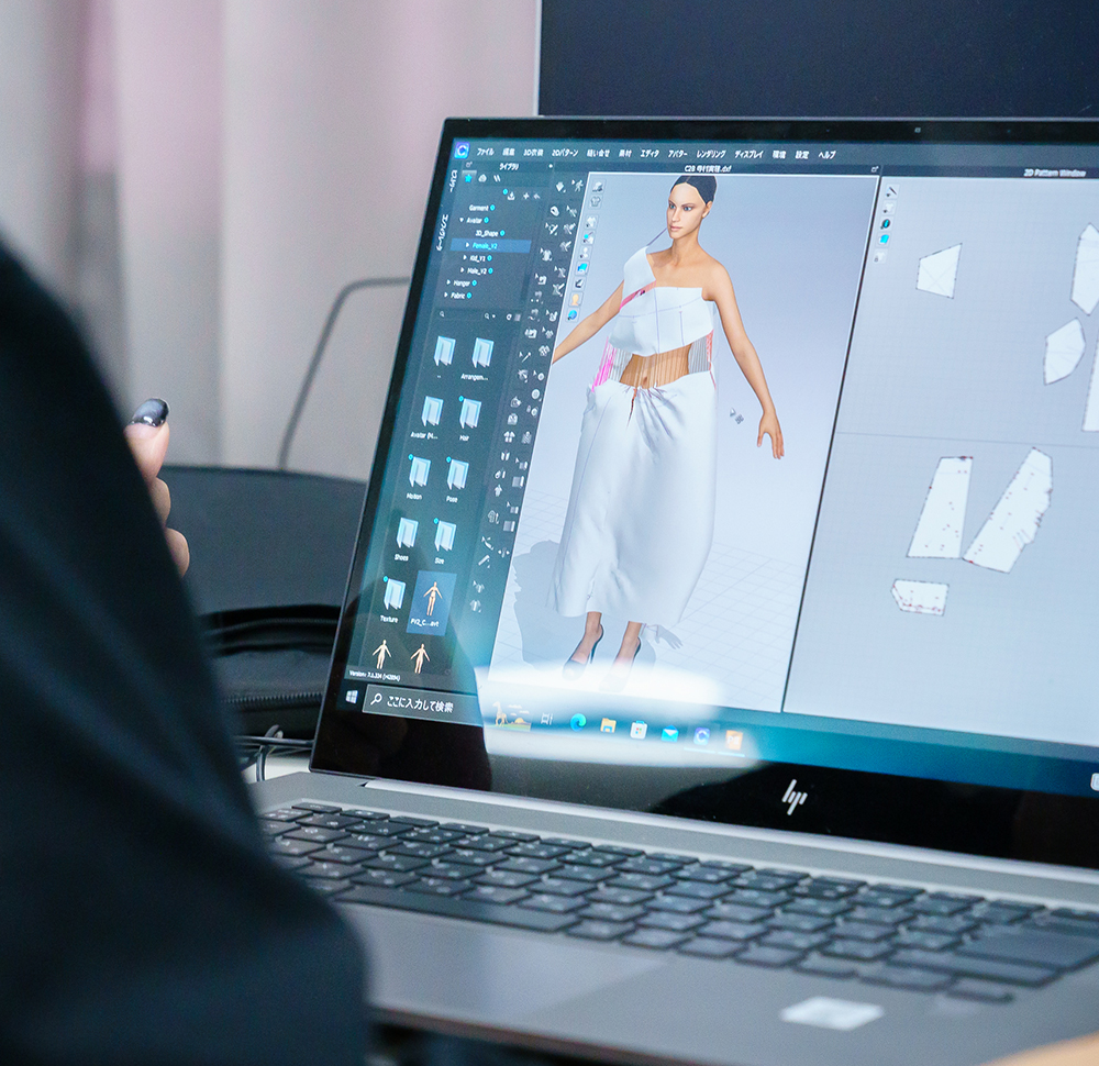 VRファッションコースはこちら生産プロセスにおける時間やコストを大幅に削減できるテクノロジーとして注目が集まる3Dモデリング。当校は3D人材の必要性を見極めて、全国初となる3Dモデリストコースをいち早く開設。当分野のトップランナーとして、教育はもちろん、協業や研究発表など業界のDXに貢献しています。また、全学科を対象としたゼミを開講し、すべての学生が3D技術を習得できる環境を整えています。